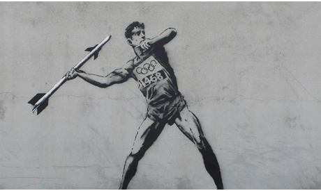 Graffiti artist Banksy produces two Olympic-themed works that challenge the glorified image of the world’s premier sporting event.
