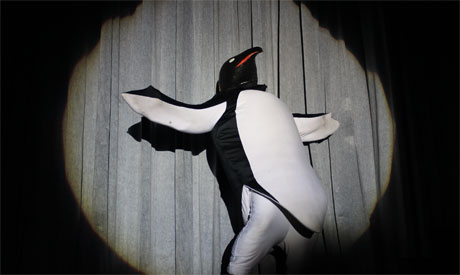 For its part Frogz, a US show by Imago Theatre based on five actors who take on different roles for their consecutive sketches, introduced lifesize puppetry, shadow theatre, black-light theatre, games with blocks, recognizable by children as animals along with imaginary shapes rolling across the stage. With no storyline and no use of language, those seemingly unrelated numbers carried the children through an elegant creative journey, simple yet brilliantly executed. Instead of searching for visual beauty, the show offered aesthetic statements, constantly shifting from the real to the imaginary. A monster-like doll playing with a giant ball took the breath of the youngest viewers with the same force as three frogs gazing motionlessly from the stage.